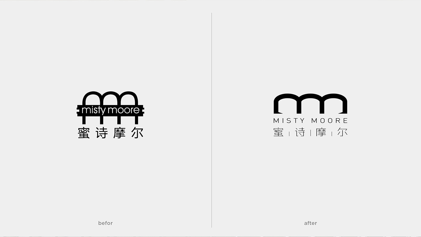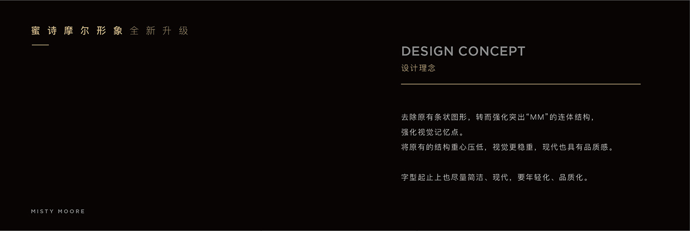 去除原有条状图形,转而强化突出“MM”的连体结构,强化视觉记忆点。 将原有的结构中心压低,视觉更稳重,现代也具有品质感。 字型起止上也尽量简洁、现代,更年轻话、品质化。