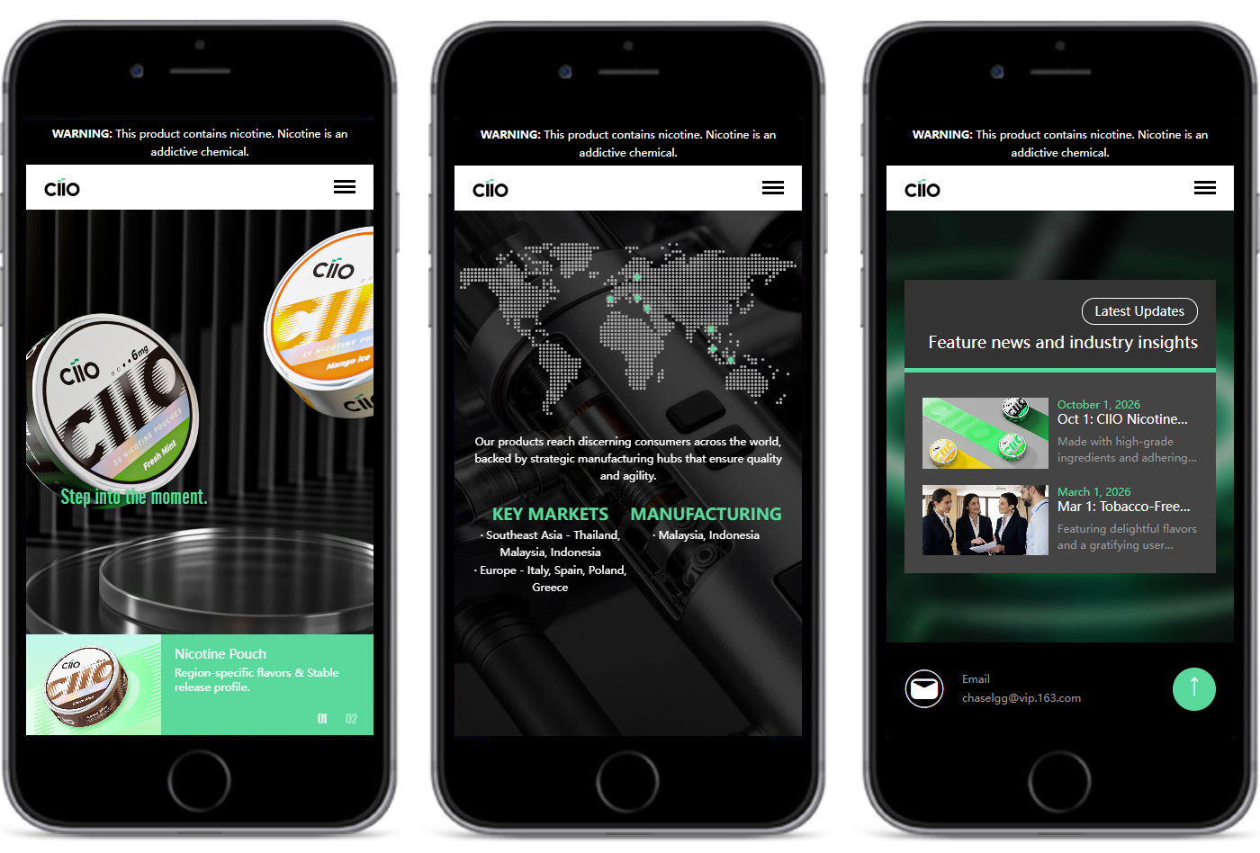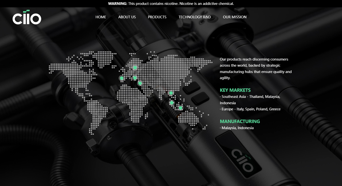 Ciio致力于为全球市场提供高品质、稳定交付的电子烟产品解决方案。依托专业高效的自主研发团队,Ciio持续攻克雾化技术、烟油配方与设备可靠性等核心难题,推动产品性能不断突破。通过精选进口优质原材料、实施严苛的质量管理体系,并严格遵循国际合规标准,Ciio确保每一款电子烟产品兼具卓越口感、稳定性能与全球市场准入资质,以创新实力和可靠交付赢得国际消费者的广泛信赖。